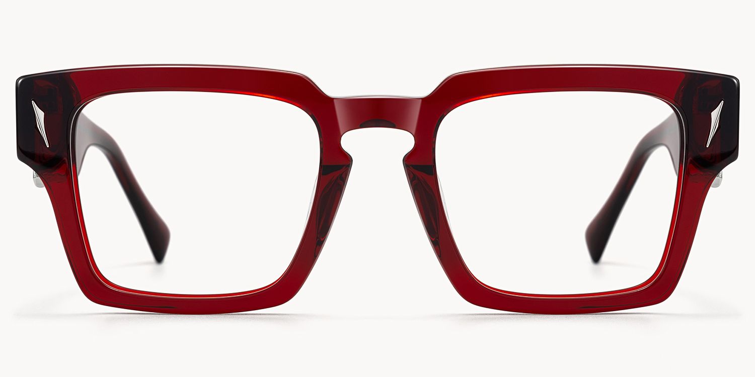 Stiletto is a thick square eyeglasses frame featuring a translucent deep red finish in high-quality acetate, delivering strength with visual depth. Precision metal dagger hinges enhance durability and control, ideal for creative professionals seeking expressive yet composed everyday eyewear.
