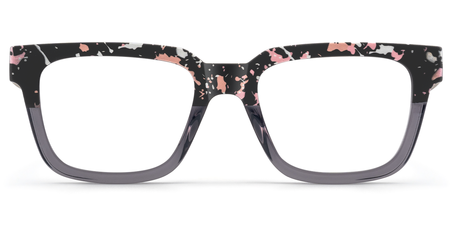 The Strobe in black acetate with splattered pink enamel celebrates the pulse of FutureFunk. Its half-frame silhouette blends strength and rhythm, creating a bold contrast of gloss and matte texture that evokes the thrill of confetti and neon haze on the dance floor.